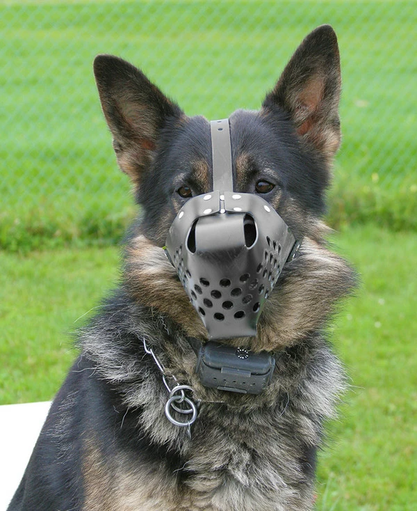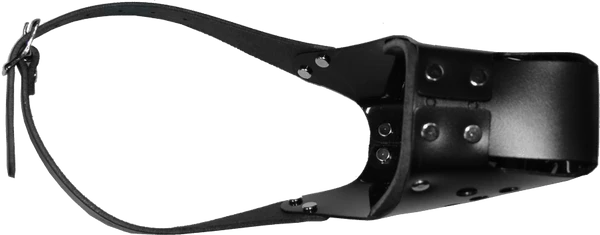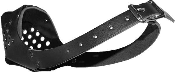 Produced for the military, this black plastic muzzle body is riveted together as well as the two ¾” wide black leather straps. The inclusion of the head strap along with the 2 side straps provides greater comfort & control. Nickel plated roller buckles provide the size adjustment.