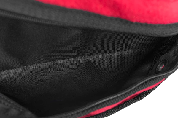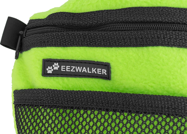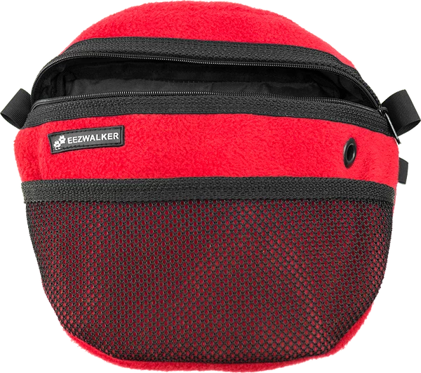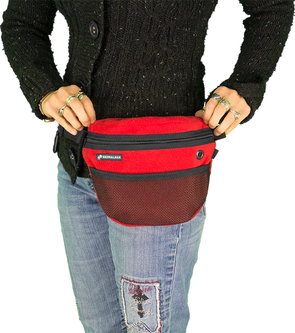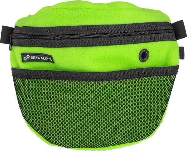 The handler bag outer layer is made from fleece and comes in all the EEZWALKER color choices. The bag opens and closes securely with a zipper closing. The bag interior is lined in water resistant lining and that makes for easy clean out with a damp towel. On the front of the bag there is a grommet opening so you can have your poo clean up bags ready to grab without having to unzip the bag. The bag is contoured to fit around the handler’s waist and is deep enough to hold training treats and other items, such as wallet, keys, sunglasses, poop bags, etc. There is a front lower net pocket for quick access items such as a phone, ID, or pepper spray that many joggers often carry.