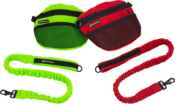 The EEZWALKER Handler Bag with Bungee Leash is a bag and leash combination that attaches around the handlers waist. This is convenient for working, walking, and jogging your dog allowing your hands to be free from holding the leash. I use hands free leashes because the dog learns to walk or run with my gate. The stretch in the bungee leash is a great feature because the give of the leash causes the leash to have smooth movement between the dog and handler. If you are jogging and stop quickly there isn’t a jerk in the leash but time for the dog to have an extra step to stop. Having your hands free makes jogging, pushing a stroller, pushing a grocery cart, opening doors, and loading the dog in and out of vehicles very useful and accessible.