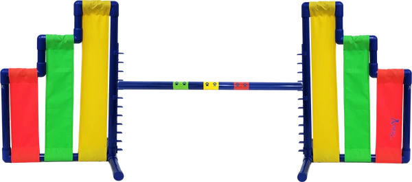 The jump frame is blue with three colorful panels of yellow, lime green, and bright orange. You can choose from a jump bar of 48” or 60” wide. The bar is triple vinyl wrapped with the coordinating colors of the panels. The two wings are free standing with an attached clip strip for setting the jump bar. The displaceable jump bar can be set from 4” to 26” in height.