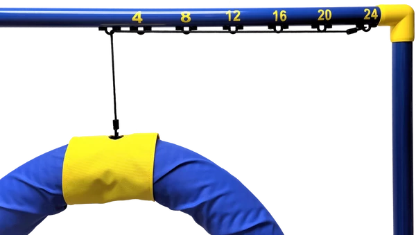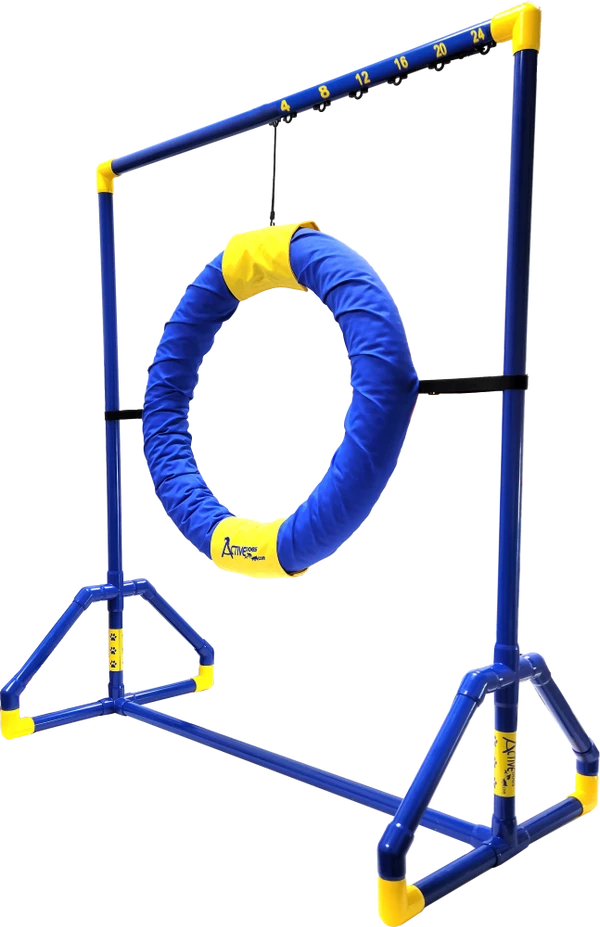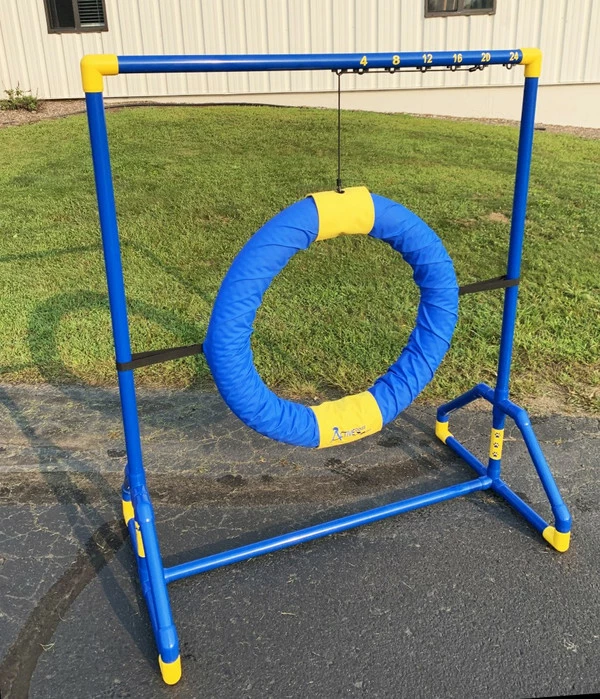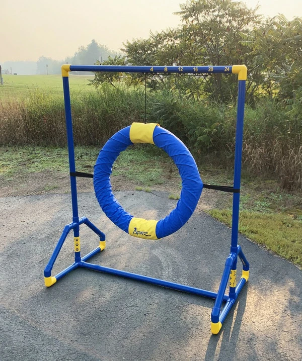 The Standard Tire Jump is AKC competition size. The tire has a 24” center opening, there are 6 height adjustments from 4” to 24”, and there is 8” between frame and tire. Easy to follow directions are included. The tire jump bottom leg A-frames are glued for easy assembly. The tire is fully assembled and shipped assembled. The Standard Tire Jump and Tire Ring are blue with yellow highlights. It can be used indoors or outdoors.