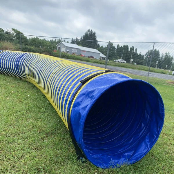 Our 24” x 12’ Heavy Duty Agility Tunnel is an open tunnel, meaning both ends of the tunnel are open. This tunnel is constructed from 14ounce PVC coated vinyl, and is weather, fade, water, flame & scuff resistant. Our Heavy Duty Agility Tunnel has a 4” pitch which means there is 4” between the spiral wires which is required for competition.