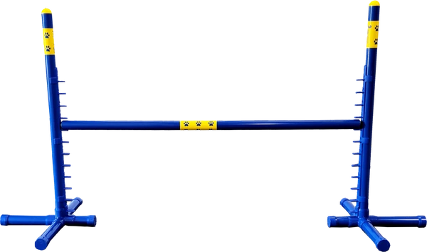 The Activedogs.com Pedestal Jump is part of the “Premium Series” line of agility equipment. It measures 36” tall. The Pedestal Jump frame poles are 1.25” O.D. This jump is stable because it has 4 feet at its bottom. The pedestal jump frame is blue with yellow vinyl wraps on the upright poles and on the jump bar. There is no tape on the jump and comes already wrapped for you. You can choose from a jump bar of 48” or 60” wide. The displaceable jump bar can be set from 4” to 26” in height.