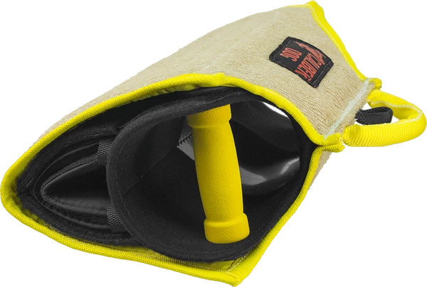 The CaliberDog Bite Developer is made by professionals for professionals. This sturdy sleeve will last for a long time when the sleeve cover is used. The sleeve is made from NK material which is specially made for bite sleeves. There is no more metal or hard plastic for increased safety for the canine. The sleeve bite bar can be adjusted in 3 ways. There are 2 inserts in the bite bar which can be removed to decrease the stiffness of the bar. This feature is ideal for training puppies or canines new to bite development. There is a padded handle inside the sleeve for comfort. The barrel of the sleeve is made from hard plastic to protect you from any missed bites. The hand stitching not only make the sleeve look great but it gives it outstanding durability.