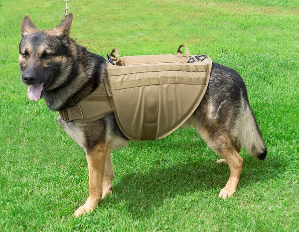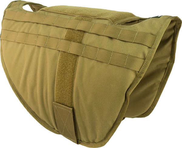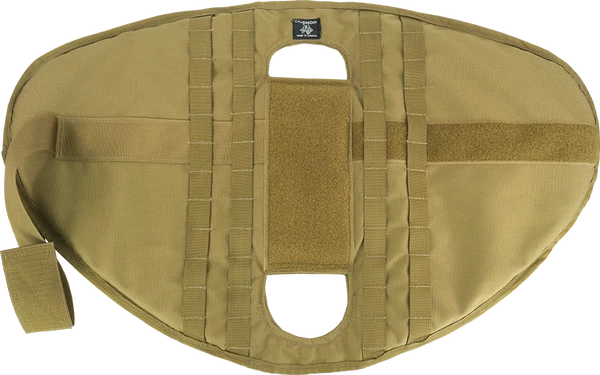 This Stab and Bullet Panel is designed to fit over the CaliberDog K9 Tactical MOLLE Vest. It is Level III gunfire protection and stab protection. When used with the Tactical MOLLE Vest the vest back handles and V-rings of the tactical vest fit through this cover so they can be accessed by the dog’s handler. There are two sets of MOLLE straps and the wide Velcro on top so you can still use the camera mount with this Caliber Dog Stab & Bullet Vest Cover. This product is a lighter weight solution to a bullet K9 vest and can be quickly detached from the vest. Bullet vests for working K9s are generally hot and heavy for the dog to work in. The convenient part of this stab and bullet vest cover is that it so easily and quickly attaches and detaches off of the Caliber Dog K9 Tactical MOLLE Vest. With the CaliberDog stab & bullet cover, the K9 is primarily protected on its side and back. Comes in two colors: black or coyote. USA MADE