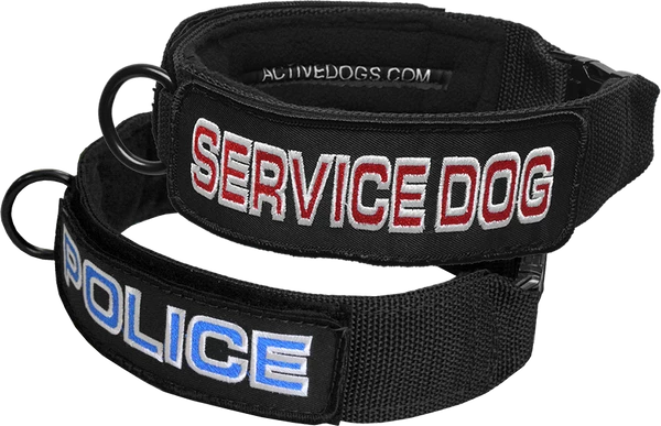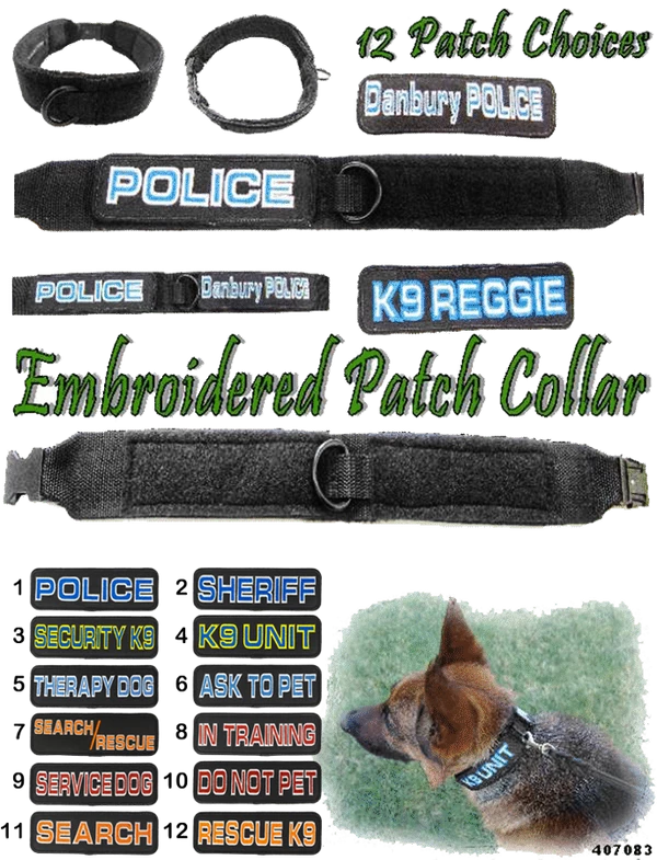 The collar comes with 2 embroidered patches. They are embroidered in a two-tone style using strong polyester thread for long lasting quality. All the patches come with Hook and Loop attachments so you can interchange them. Custom patches of the same size and style are available if you want your dog’s name or department on the collar.