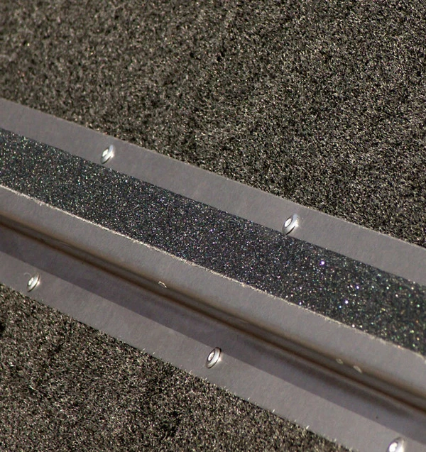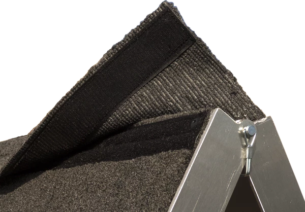 With the unique laser cut hinge system this scaling wall easily folds for convenient storage and transport. The frame is constructed of non-rust aluminum. The toe grips have a non slip surface on them. The top deck is sturdy no maintenance aluminum that is then carpeted and riveted for extra durability. We have designed this wall to be durable yet light weight. No tools required for set up just simply open up the two halves and place the lock pins in position.