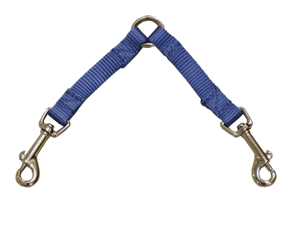 A handy way to walk two dogs at the same time. A 2 dog coupler for small dog breeds. Each strap/leg is 4″ long, 5/8″ wide nylon webbing terminating in nickel plated steel bolt snaps.