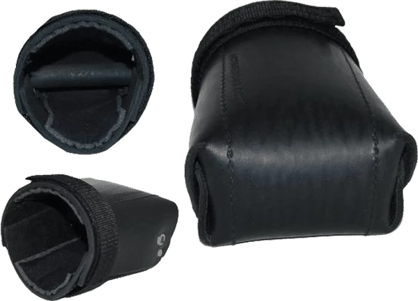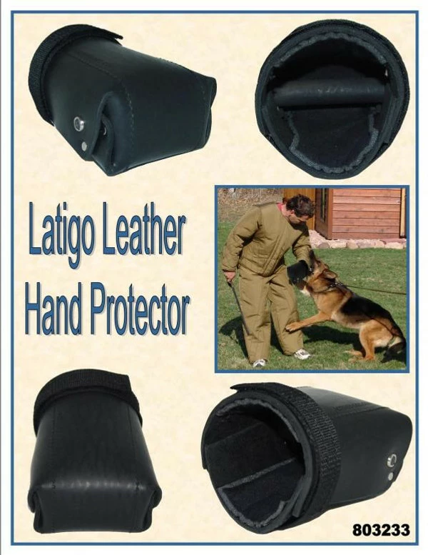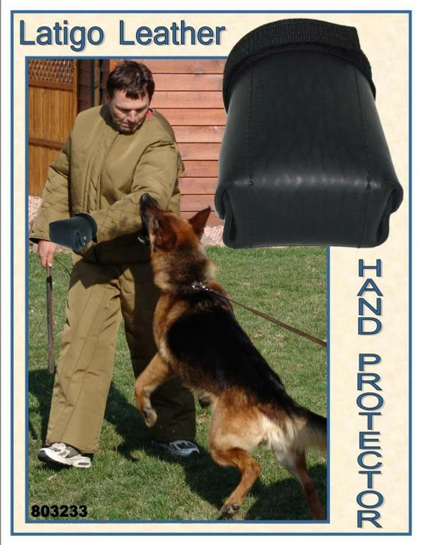 Hand protection with a interior grab bar. The Leather Hand Protector is like a hard leather mit of protection. The Leather Hand Protector is made of thick, latigo leather and is padded on the interior for comfort. The grab bar (inside the hand protector) and the adjustable Hook and Loop strap (around the wrist area) help to keep the hand protector in place. It can be used on right or left hand. Can be used with the bite suit or bite sleeve during training to protect the fingers/hand.