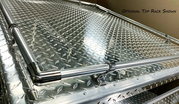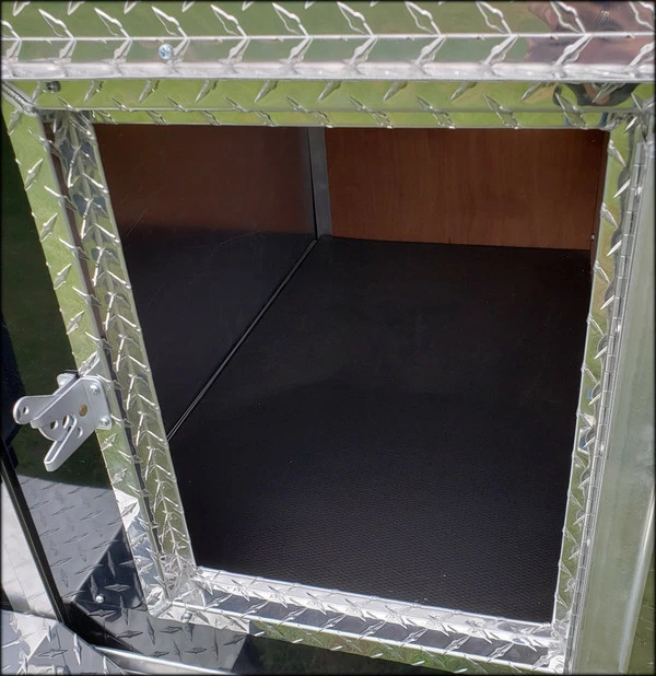 One of the best features of this trailer is the storage. The top of this trailer has a hinged air lift lid weather tight storage compartment. The front also has a large storage box with air lift and built in drain plug. This box also has a lockable latch to keep your items secure. With 2 large storage areas you can carry all the extra items needed when traveling and great to have a dry place to store gear. The exterior surface of the top storage is covered with attractive aluminum diamond plate. It is 5 ¼” deep with carpet and a divider. There are two pneumatic lifts for the lid and they will hold in strong winds. The top compartment locks and comes with key. The full size of this trailer is 84″L x 52″ W.