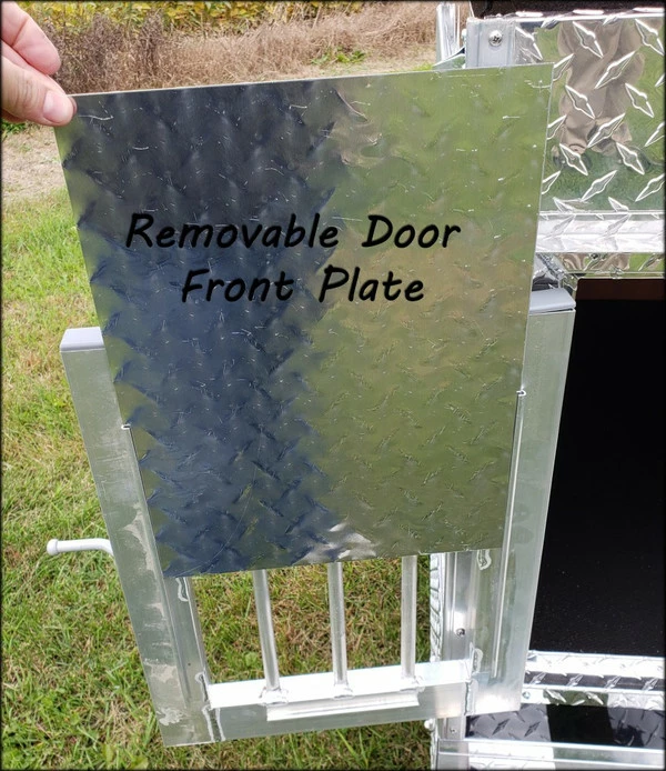 The doors are welded aluminum jail-house style doors made from 1” x 2” aluminum extrusion and round rod. They are tall doors, making easy access for the dogs jumping in and out of the trailer. The doors have removable aluminum door covers. Door size is approx 13”W x 17”T.