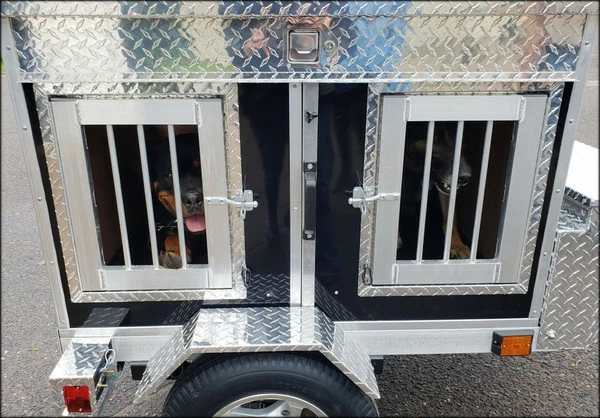 This trailer has insulated and noise reduction interior & each compartment has a rubber mat for extra comfort for your dog. The center divider is removable to make this 2-dog kennel into 1 large compartment. To take out center divider simply pull the lock pins, remove the fender, unscrew the security thumb screw above the handle and pull out divider. Both kennel compartments have large slider vents to provide great cross ventilation & maximum airflow. There are no slots or small holes like other trailers which will starve airflow to the dog. There are four o-rings on the trailer exterior for tying out your dogs while parked. On the front of the trailer there is an weather tight lockable compartment that gives you even more storage while traveling.