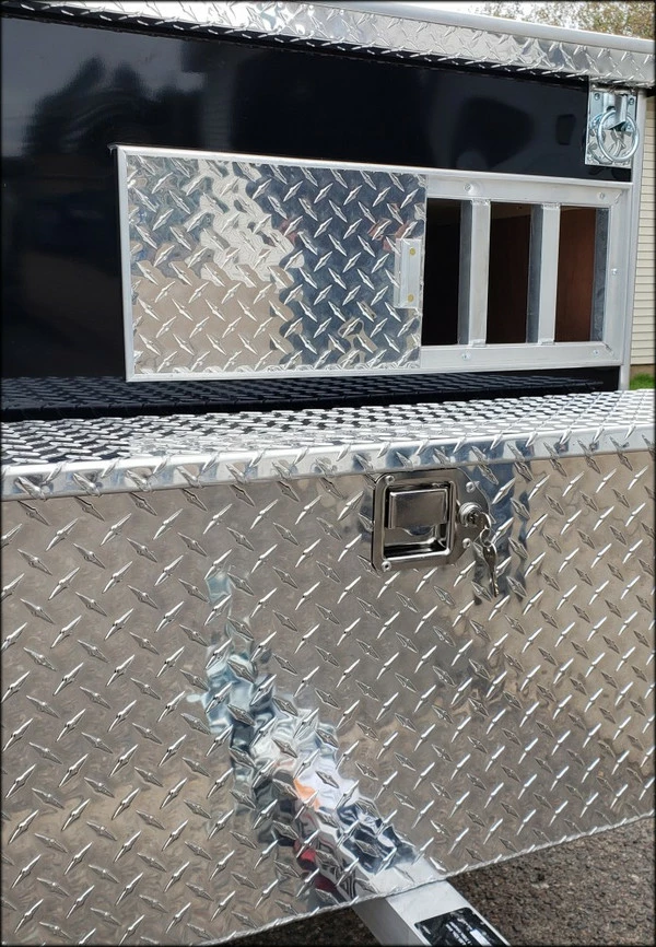 Specifications: Black aluminum exterior color w/ Diamond plate Aluminum trim. Double wall construction, .030 gauge smooth aluminum outer skin, ¾” foam board insulation, lauan interior sheathing, controlled air flow slider vents on both sides, aluminum doors, ½” plywood floors, weatherized hinged lids, pneumatic lid lifts. Tires are 5.30 x 12.