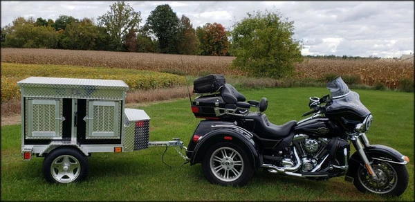 Just how fun would it be to bring your dogs along while traveling the open road on your motorcycle or small vehicle. Many dog events we have attended we see bikes, trikes and while talking to the people driving them they all seem to make the same comment, “we wish we could travel with our dogs on our bike”. Now that is possible with the ActiveDogs motorcycle dog trailer. Our trailer will hold two dogs with top storage and front storage.