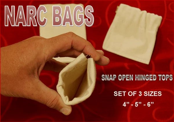 The Narc Bags are made of cotton, duck cloth fabric. These Narc Bags have a handy, snap open metal hex frame at the top.