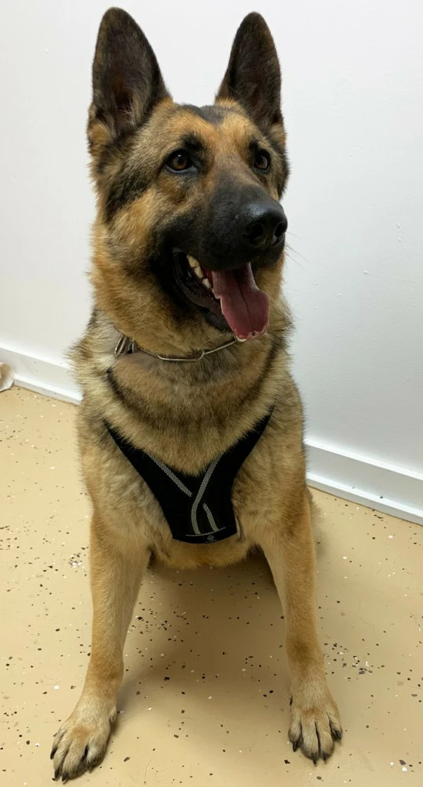 The dog’s leash is attached to the harness by using the top metal D-ring. By attaching the leash this way there is no pressure on the dog’s neck and throat. This also gives the dog better balance because the center of gravity is over the dogs shoulders.