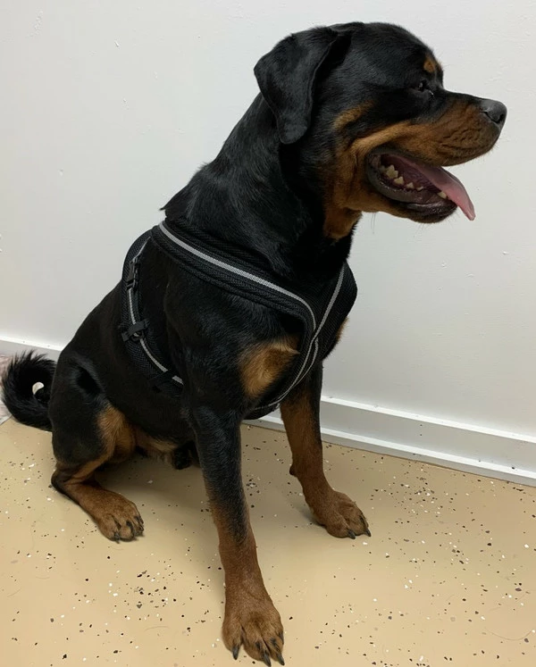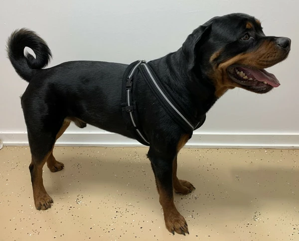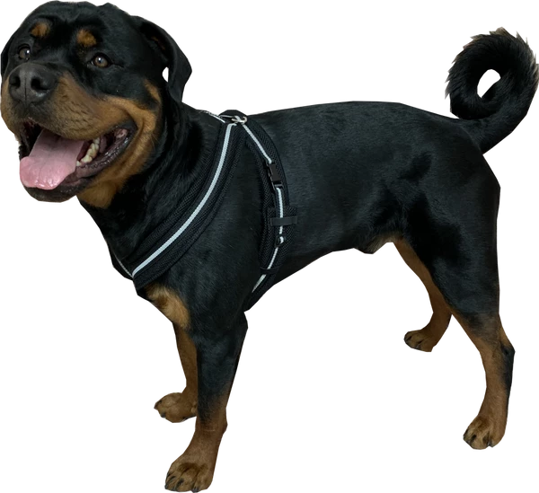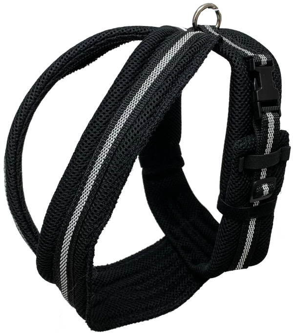 It takes very little effort to put this harness on your dog. Simply slip the harness over your dog’s head, between the front legs and then the Dog harness buckles back to itself at the dog’s shoulders with two side release buckles. The girth strap can be adjusted for better fit. The dog cannot back out of the harness and it fits firmly around the dog’s chest and girth. Because the padded Air Mesh material is wider than the reflective webbing of this harness, there is no stress on the dog and it is unobtrusive and breathable.