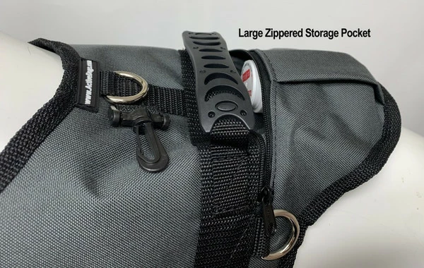 The Padded Dog Vest with Zippered Pocket builds upon our best selling Padded Harness Vest. This new vest now is offered with a zippered pocket on the top back of the vest. The zippered pocket opening is approximately 5″ wide and the max depth of the pocket is approximately 5″ deep. This dog vest is made with weather resistant, 1000 denier fabric so it is flexible yet sturdy enough to last for years. The inside of the vest is lightly padded for your dog’s comfort. All seams are bound and reinforced for added strength and durability.