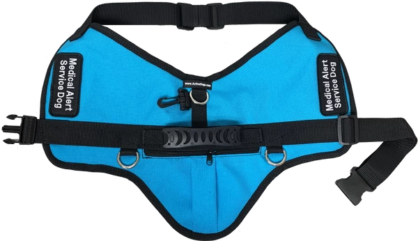 The vest fits over the dog’s head and attaches with a wide, quick release buckle on the adjustable girth strap. The front chest strap has two slides for two-way adjustment to better fit your dog.