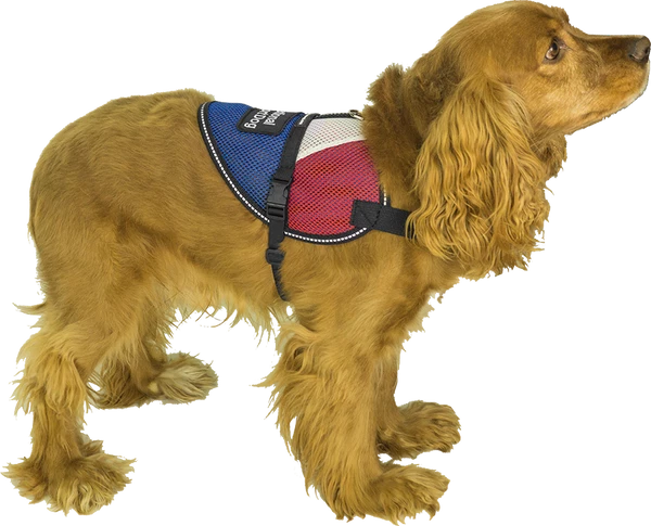 We designed this vest to honor our American disabled service veterans. It has been designed in a red, white, & blue color scheme like our American flag colors. The Patriotic Tiny Dog Mesh Vest is made with two layers of mesh for strength and durability and is designed with heat, humidity and water in mind. The vest is bound in reflective webbing for an added safety feature. There is a D-ring on the vest for attaching a leash.