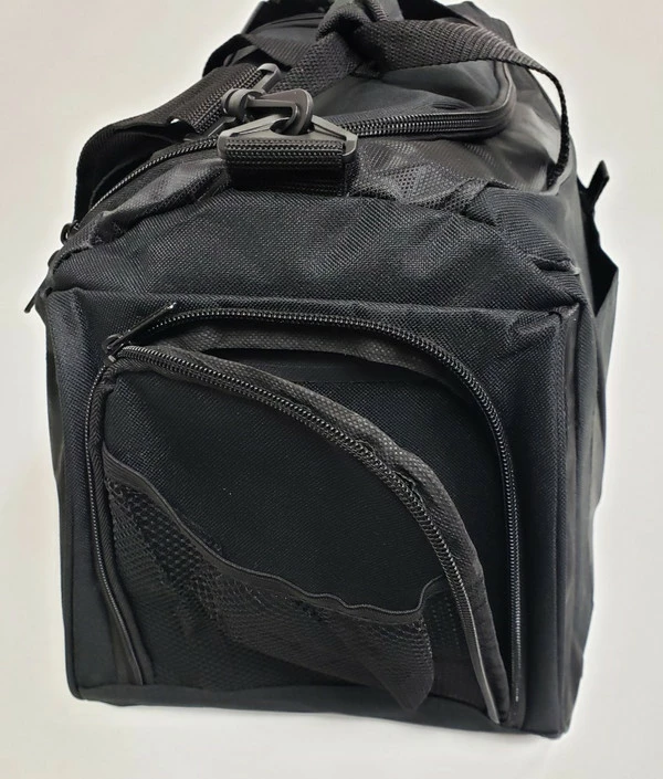 The Breed Specific Duffel Bag is a 600 denier black nylon with polyvinyl coating. The interior of this bag can be easily cleaned. It has a mesh water bottle pocket and a slip pocket on one side. The bag has carrying handles and an adjustable shoulder strap.