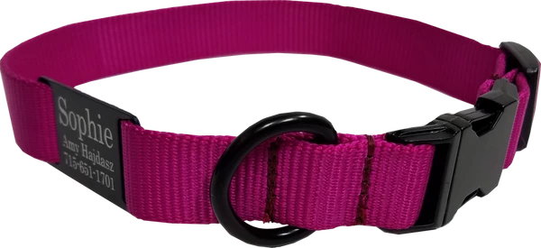 The Personalized ID Nylon Collar has an engraved metal dog tag woven into the webbing so that you do not have any tags dangling down or getting in the way. All of our Nylon collars are made with a heavy duty thick nylon webbing, and are double stitched to ensure top quality.Finished off with black metal buckle & D-ring make this collar extra durable and look great at the same time. This collar comes in 11 color options & 2 sizes. Made in the USA
