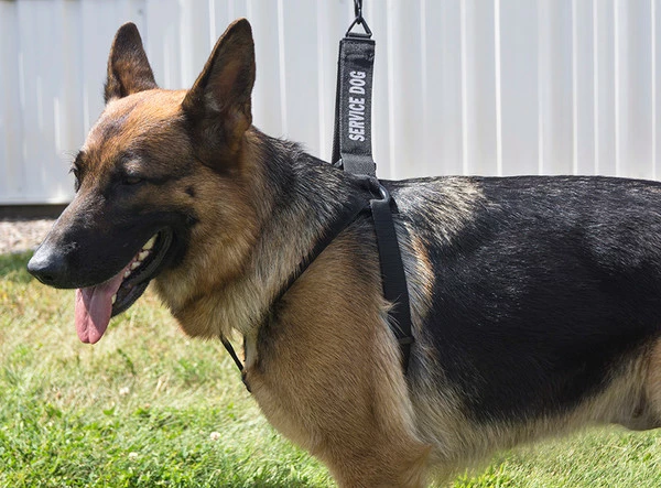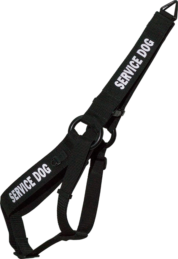 The Step-In Service Dog Harness & Leash is made with black webbing and your choice of red or reflective silver text. All the hardware on these harness & leash sets are black. The leash has a cushioned comfortable handle and a black bolt spring snap. All the straps of this Step-In Harness are adjustable and the harness will fit dog’s girth measurements from 24” to 38”. Choose from several text messages or have your own custom words put on this harness & leash set.