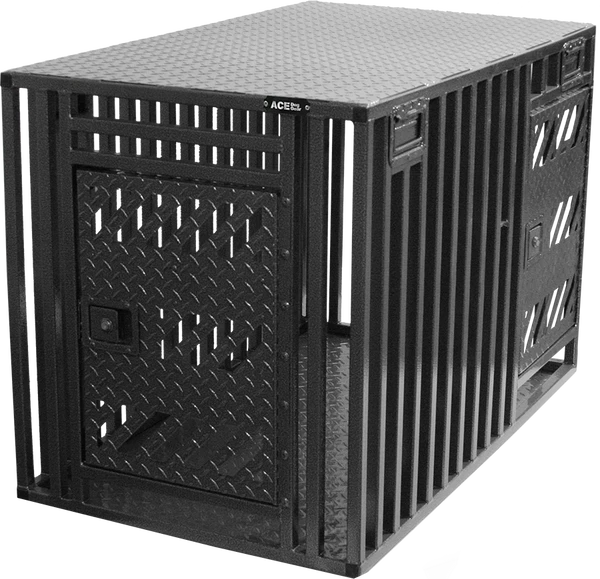 The double door dog crates feature a door on the end and a door on the side. The top and bottom of the crate and the doors are polished, 1/8″ thick diamond plate aluminum. Each door is laser cut, double reinforced, and features a stainless steel, locking door latch with one key. The doors can be latched with or without locking it.