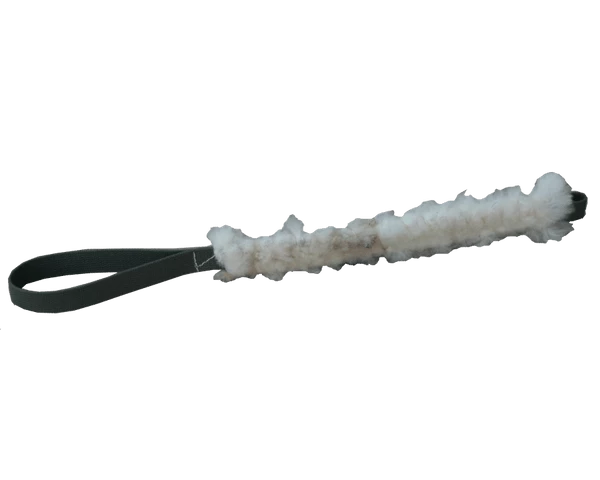 This training tug has a dual purpose as a motivational dog training tug and it can also be used as an assist dog training tug or a tool for the handler to open doors. Our natural Shearling training tug is made from real sheepskin. It is soft on the dog’s mouth but very strong as we have stitched it onto heavy cotton webbing. I like the natural non slippery woven cotton webbing handle as it gives a firm grip. This large size loop handle is big enough so the tug can function as training and operating aid for a disabled handler. The tug handle can be placed over door knobs or handles to aid in opening doors. Overall length of this tug is 24 inches.