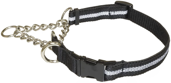 The Martingale Training Dog Collar is made with two layers of webbing. The top layer of webbing is reflective. A metal martingale chain, contoured side release buckle, and welded D-ring are used, making it more durable.