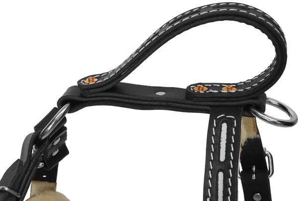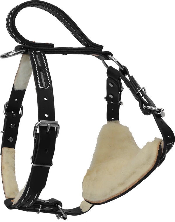 The front chest pad and straps are lined with real sheepskin padding for the maxium comfort. Reflective material is used throughout the entire harness for optimal visibility. The chest and girth straps are adjustable.