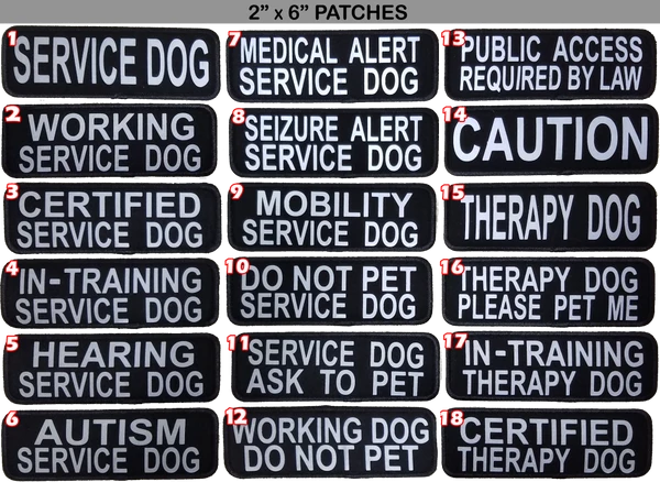 Reflective patches will reflect a light source which will cause them to shine in the dark. The reflective patches add a safety feature to any dog vest, harness, or clothing. Choose from 18 patch text style choices. Choose from three sizes; 1.5″x 3.5″, 2″ x 4″, 2″ x 6″.