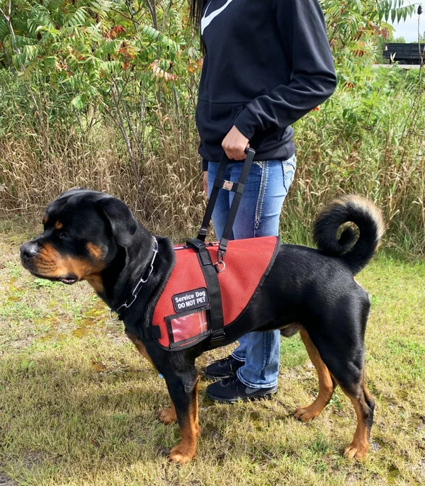 Bridge handles are used in conjunction with our service dog vests and harnesses. The purpose of the bridge handle is to give an extended reach between the dog and the handler. This handle will attach to our Guide Dog Harness, Mobility Harness, or any other of our Service Dog Vests that have the two D-rings on them.
