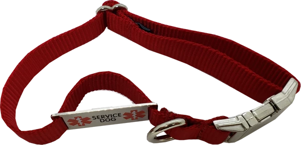The Service Dog Chrome Tag Collar is a service dog collar with a high quality engraved tag. The chrome tag is engraved with the words Service Dog. This adjustable collar is ¾ inches wide which will work with any size dog. This is a well-made collar with sturdy all metal hardware. There are two color choices and three size choices. Matching Service Dog Hands Free Leash also available. Made in the USA at activedogs.com