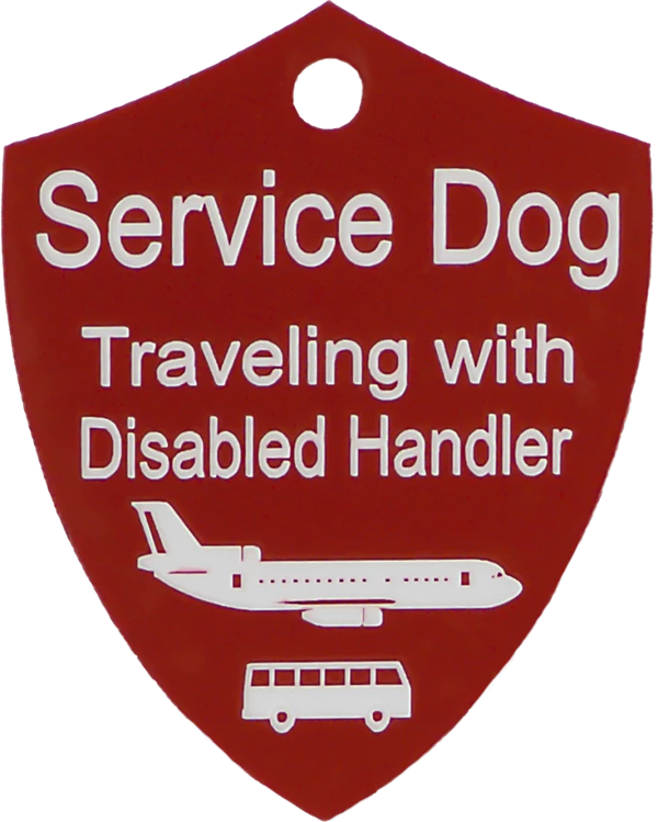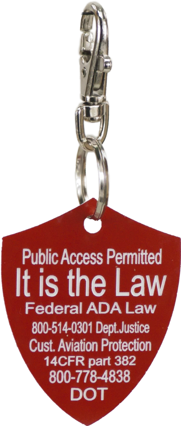 The Engraved Service Dog Travel Tags are perfect accessory when traveling with your service dog. The tags are a shield shape with engraving on both sides of the tag. The tag reads Service Dog Traveling with Disabled Handler on one side and ADA law on the other side. This tag come with a split ring and a easy to use chrome trigger snap, making this tag easy to attach or change locations if desired. The Engraved Service Dog Travel tag is approx 2″x2.5″ making it the perfect size to clip on any collar, vest, harness, or carrier. Made in USA