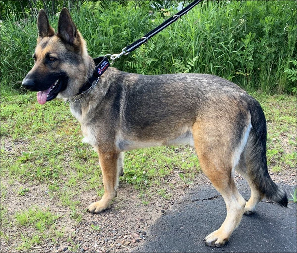 A martingale style collar is one that when you pull on the D-ring the collar will become tighter on the dog. This is a good collar for working the dog in public when you may need a little more control or when training the dog.
