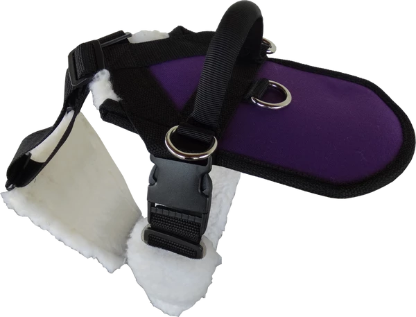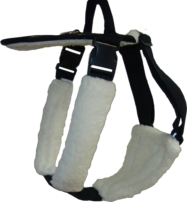 The front chest straps have double adjustments. The girth has two side release buckles and adjusting slides. All the stress points on the dog are padded. The underside of both the back plate and chest plate are felted, and then covered with sherpa. The girth strap has two removable washable sherpa covers. The back and chest plates are covered on the top with rugged 1000 denier materials.