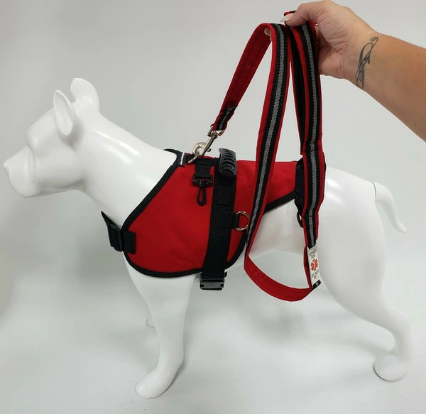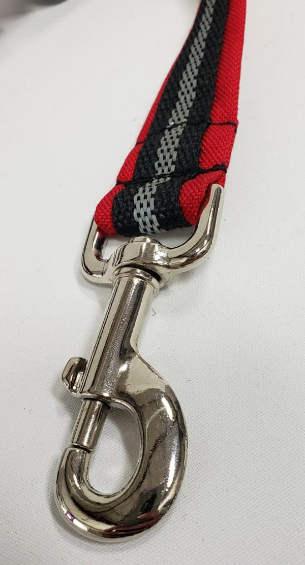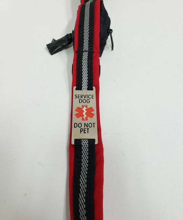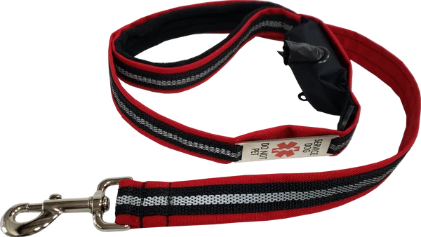Now you can match your service dog vest with a color coordinating leash. This Service Dog Reflective Built-In Poop Bag leash comes in all 13 colors that we offer in our service dog vests. The Service Dog Reflective Built-In Poop Bag Leash is very convenient because it’s a leash and poop bag dispenser all in one high quality product. The best part of this poop bag leash is that a separate poop bag dispenser is not dangling and flopping around when walking your dog. It’s built right into the leash. This leash comes with a chrome metal Service Dog identification tag stitched into the leash. The Service Dog Reflective Built-In Poop Bag leash has a comfort fleece lined handle. Another nice facet of this leash is the light-weight D-ring near the grip for carrying items you may want to bring along, such as your keys, hand sanitizer, etc. The metal swivel bolt snap is double stitched into this leash to attach to your dog’s collar or harness. The entire leash has reflective materials stitched on it. The length of this leash is 50” long.