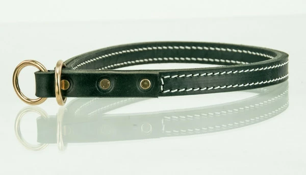 Our Leather Choke Collars are hand made with two layers of soft Latigo leather. They are craftsman stitched with white thread. This collar is an easy and effective training tool. Outfited with 2 Solid Brass O-rings this collar is sure to last a life time.