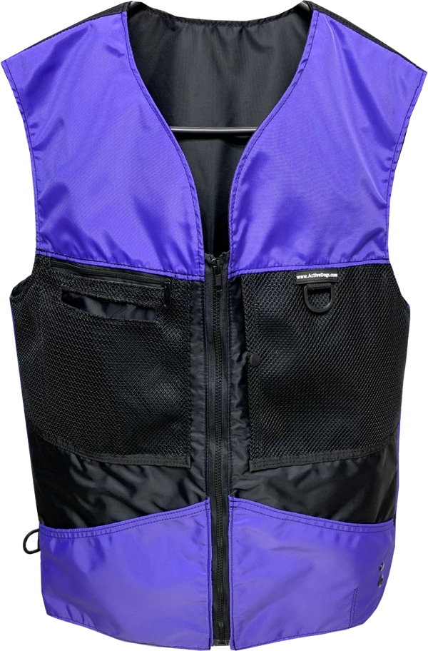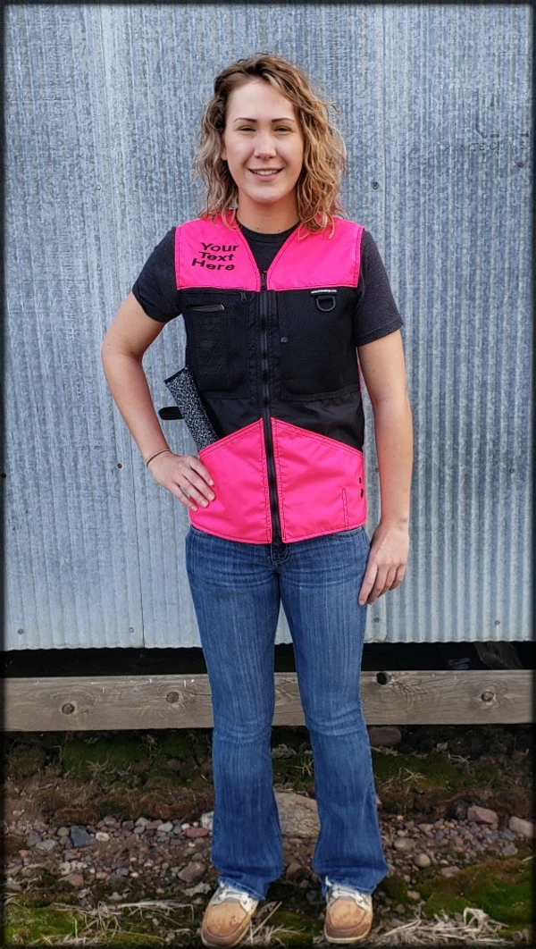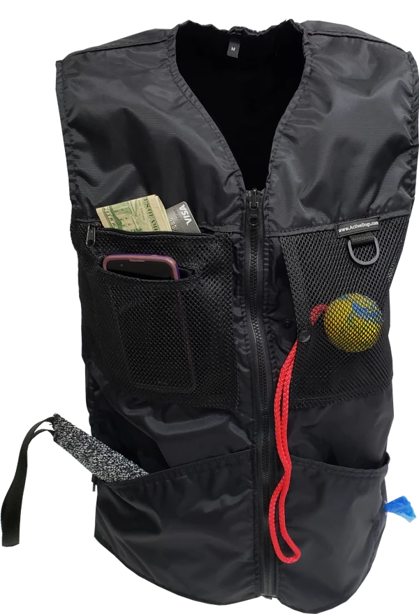 This vest was designed with a specific purpose in mind. I not only required storage in my handler vest but I wanted identification. When I am in public training a service dog I have often thought I should design an embroidered back handler vest stating “Service Dog Trainer” so people will not disrupt me while I am training. The Trainers Choice Embroidered Handler Vest does just that. This vest comes embroidered if you choose or you can have it with no embroidery. It is light weight without restriction in the neck and armhole areas so you have easy movement. It is fully lined, no scratchy seams and has a full front molded zipper. Another issue is always that pesky dog hair but dog hair dose not stick to this fabric. The vest is easily cleaned by wiping off with damp towel. Lots of pockets and D-rings on this vest, you can never have too many storage pockets. There are 7 pockets on this vest. The back has a full width pocket that can be accessed from either side, with a top center D-ring. I like this D-ring for hanging of a short pull tab or a small tug. On the front of the vest there are two large lower pockets. The top area of the vest has a great side opening mesh pocket, this works well for draping a tug or roped ball and letting the dog see it for motivation. On that same mesh pocket there is another D-ring at the top, this can be used for the same purpose. It also works great to hang a remote controller. The other side of the top has a double pocket. A mesh pocket with top opening, this is where I put my phone so I can easily hear and see it. Behind that mesh pocket is a zippered pocket, a good feature if you want to secure keys or smaller loose items. One of the best features of this vest is the built in poop bag holder. The bags are easily accessible from the vest exterior. Convenient to load on the vest lower left side. The lower right side of the vest has another D-ring. This work for hooking your leash. We will custom embroider this vest for you. You can have your text and/or logo put on the vest front. The Trainers Choice Embroidered Handler Vest is black in color and comes in five sizes. USA MADE